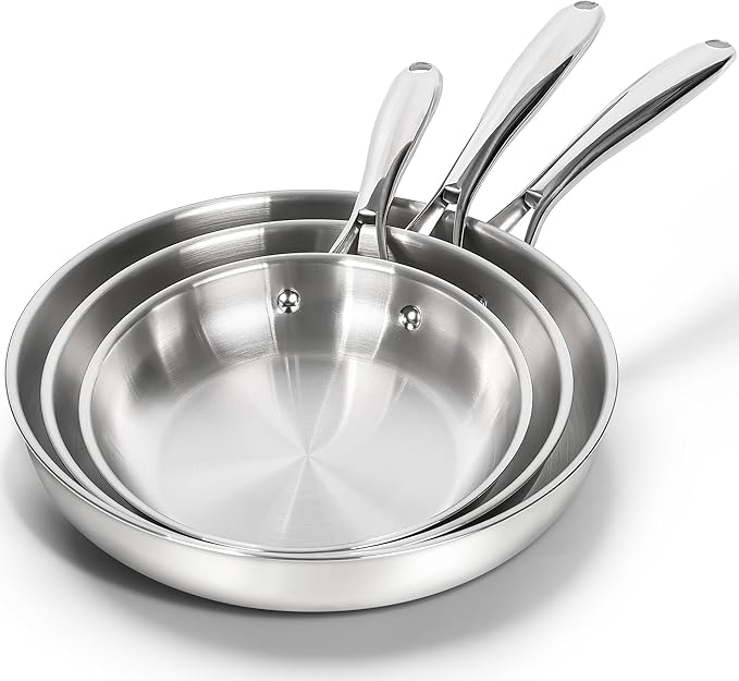 Crafted from high-quality 18/10 stainless steel with a tri-ply bottom, these pans ensure even heat distribution and long-lasting resistance to rust and corrosion. Equipped with heat-resistant, ergonomic stainless steel handles, the set promises safe handling, while its dishwasher-safe surface makes cleanup effortless, catering to busy lifestyles.