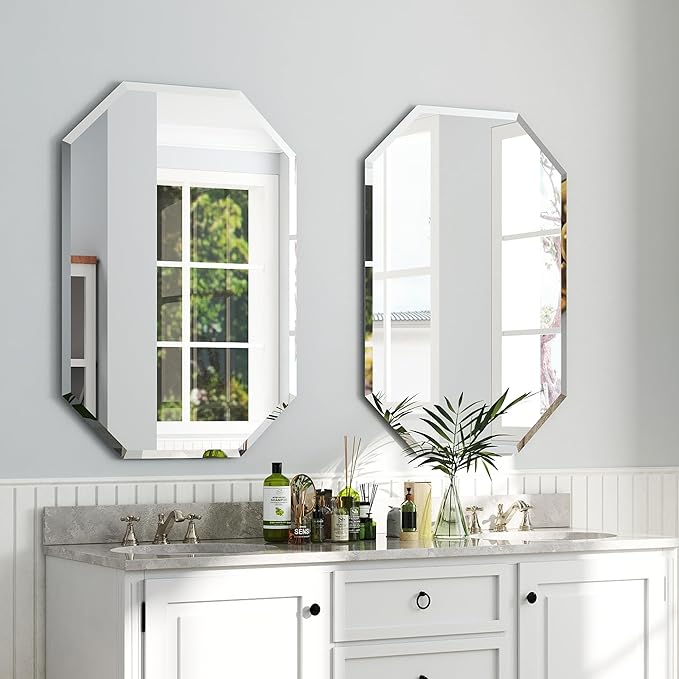 Transform your bathroom into a sophisticated sanctuary with the Chende 2 Packs Bathroom Mirrors for Wall. Measuring 24×32 and constructed with a chic octagonal frameless design, these mirrors add a sense of space and brilliance, making them the best bathroom mirrors for double sinks.