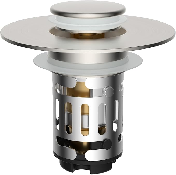 The QYHNYJF Bathroom Sink Stopper features a 2-in-1 design that combines a durable pop-up mechanism with a built-in hair catcher. Constructed from premium stainless steel and brass, this stopper not only promises ease with tool-free installation but also ensures long-lasting durability.
