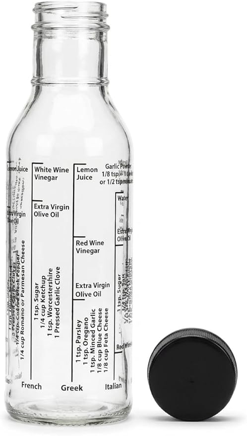 Designed with convenience in mind, this 10-ounce borosilicate glass bottle is ideal for preparing dressings that serve two to four people. Recipes for classic dressings like Italian and Creamy Ranch are printed right on the bottle, making it easy to create crowd-pleasing flavors.