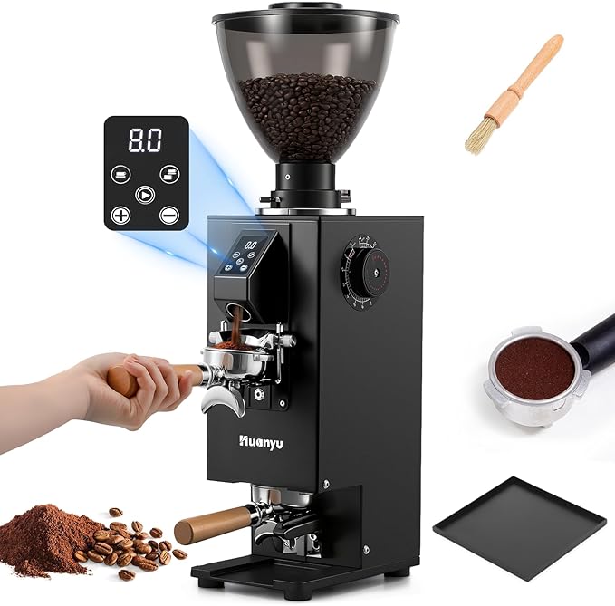 10. Huanyu Commercial Coffee Grinder, Built-In 58mm Auto Tamper, 64mm Flat